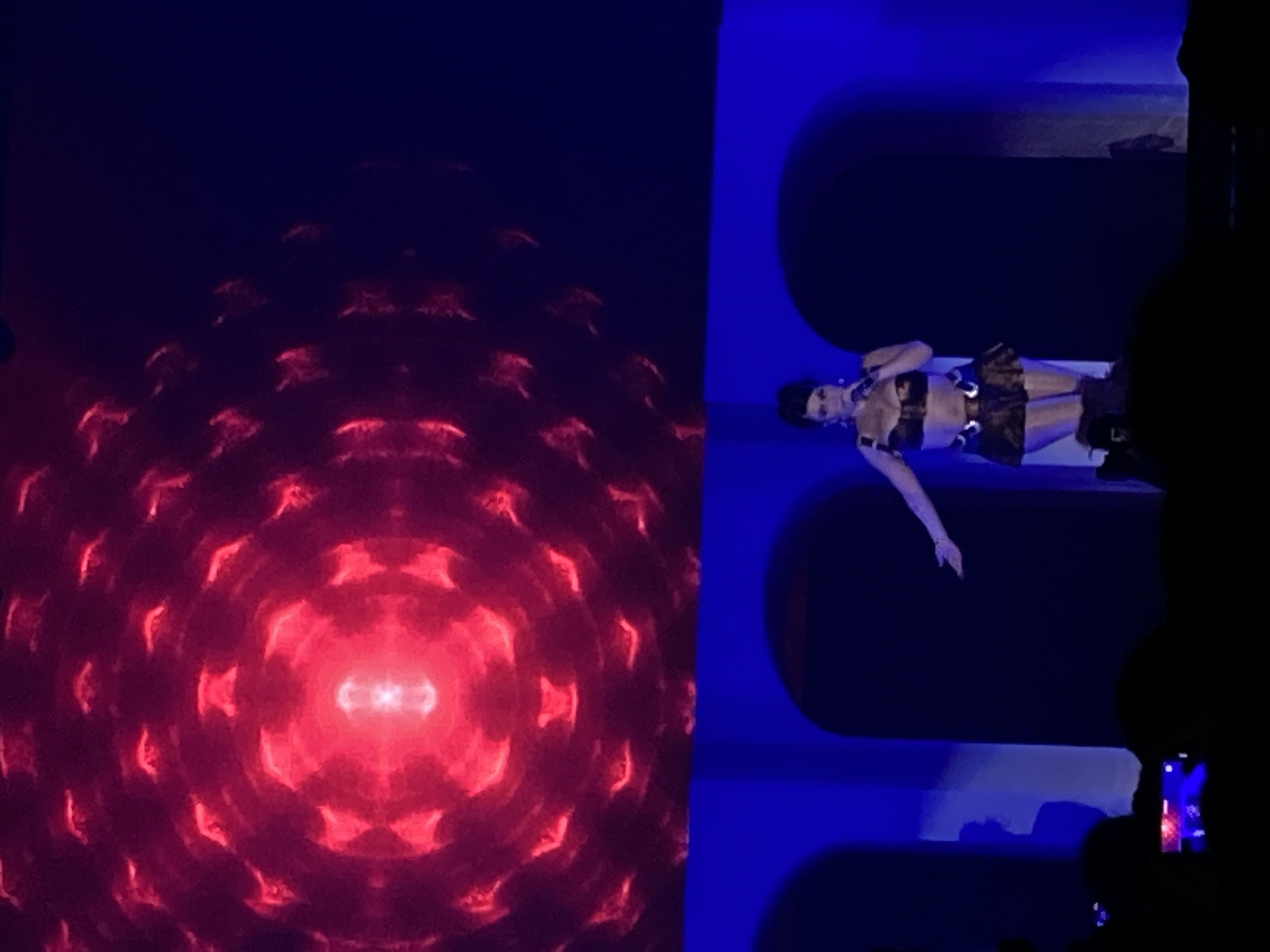 Kali Uchis’ stage setup included the three arches and steps up to those that were seen in her Coachella performance, which gave a lot of room for visual layering with the backup dancers. The show began with an extended intro, juxtaposing images of the sun and rain on the backing display. Then those visuals changed to a heart, and backup dancers led a Uchis up to the center arch, blocked from the audience with what looked like palm leaves. They pulled the leaves aside and Uchis emerged. She and her dancers danced to “Frikitona” by Plan B before opening with “Telepatía” from her album “Sin Miedo.”